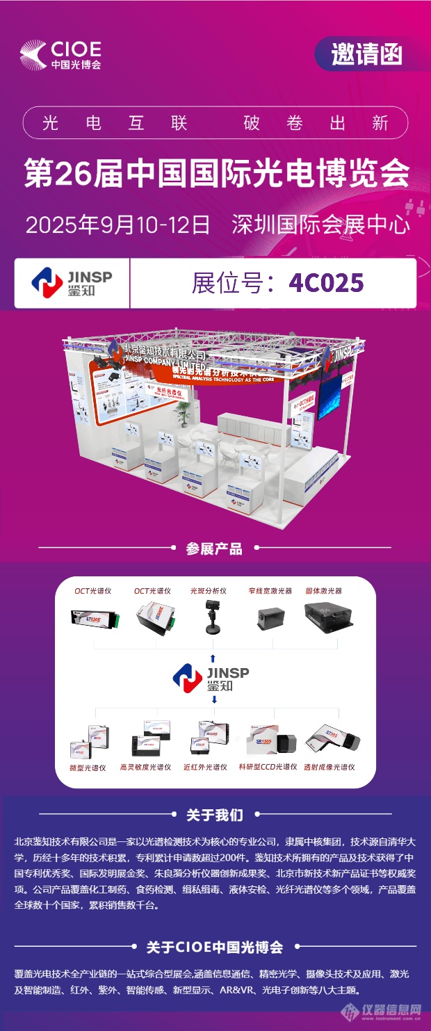 鉴知技术将携多款光电检测产品和技术解决方案亮相本次展会,涵盖光谱分析、光学相干断层扫描(OCT)、激光检测等领域,诚邀您莅临4C025展位,共同探讨行业前沿趋势与技术突破,共话行业发展新未来!