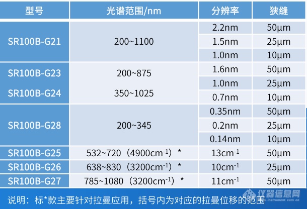 1. 光谱范围全覆盖:推荐型号 SR100B-G21(200-1100nm)、G23(200-875nm)、G24(350-1025nm),完整捕捉 442nm、468nm 顶点波长及 740nm FDP 信号,同系列 G28 因无法覆盖 740nm 不适用;